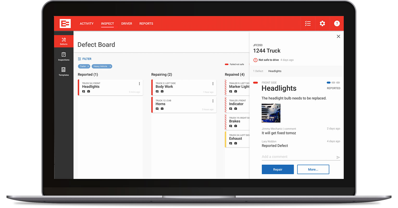 The EROAD Inspect app walks you through the inspection using customisable templates. You can capture defect details with messages as well as photos. Details are instantly visible on our desktop software – Depot - in Defect Board and Inspect reports.