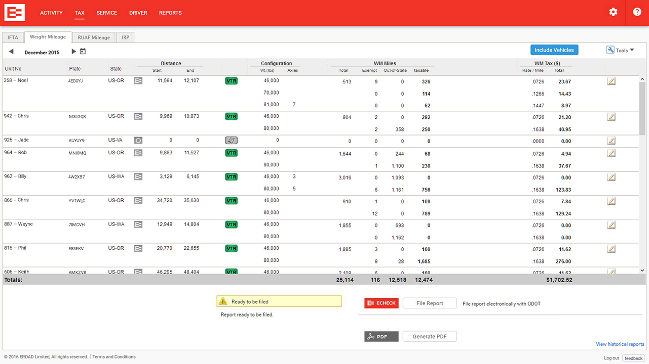 At EROAD, we’ve transformed the Oregon WMT (Weight-Mile Tax) recordkeeping experience – eliminating the need to chase down driver records, sift through paperwork, and manually enter information. With EROAD’s in-vehicle device, you’ll be confident your entire fleet’s data is accurately captured and securely transmitted. EROAD’s rapid ping rate, powerful mapping engine, and sophisticated geofence tool are unmatched in the industry, allowing you to recreate every mile of every driver’s journey all on one platform to support accurate, reliable, and auditable distance recordkeeping for tax purposes.