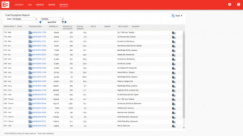 Exceptions report to identify irregular fuel transactions by location, fuel type, or when fuel consumption is outside a set tolerance