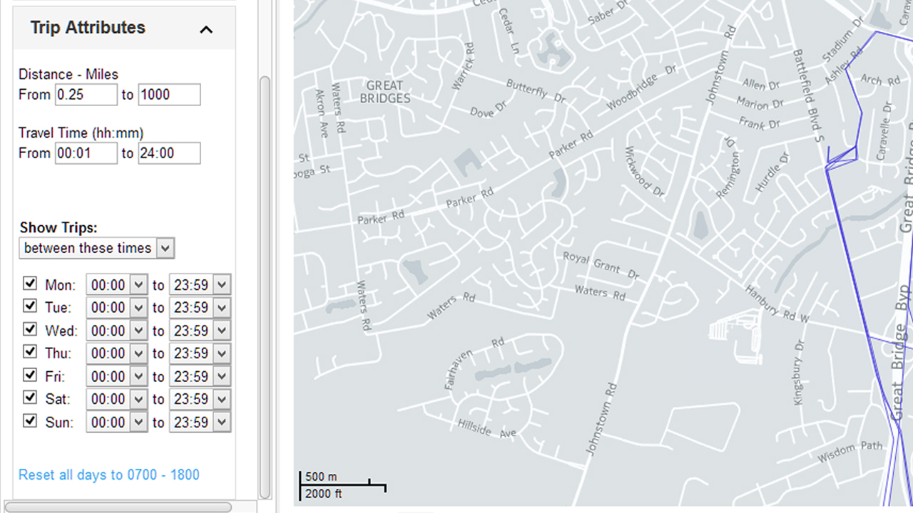 • Map visualization shows where vehicles have been traveling over a day, week or month, highlighting most and least traveled routes.