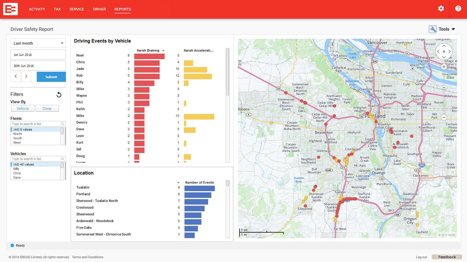 The report makes it easy to identify high-risk drivers and provide targeted feedback by driver or vehicle. You can use the map view to raise awareness of locations where drivers need to take more care for use in safety training.